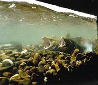 Tres meses después, los alevines salen de las piedras y comienzan a extenderse por los alrededores. En un principio se dirigen a las corrientes, pero a medida que van creciendo, al necesitar más espacio, se extienden a otros lugares.