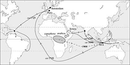 Kafe-landarea hasieran —XVI. eta XVII. mendeetan— India, Zeilan (Sri Lanka) eta Ekialdeko Indietara eraman zen, eta handik, Amsterdam-etik zehar bidez, Hegoamerika eta Mendebaldeko Indietara (2. irudia). Hori dela eta, arabiarren eskuetan, Jemeneko Mocha hirian bereziki, kafearen monopolioa 200 urtetan zehar egon zen, baina XVIII. mendean egoera aldatu egin zen. Gaur egungo produkzioaren erdia Brasil eta Kolonbiatik dator, Ertamerikako kafe-kultiboa ere garrantzitsua dela kontutan hartuz (Costa Rica, Mexiko, Guatemala eta El Salvador). Ekoizpen txikiagoa izan arren, Afrikan ere landatzen da: Angola, Tanzania, Kenia eta Ugandan hain zuzen.