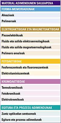 Los materiales inteligentes –smart o intelligent en inglés– se conocen también como materiales activos o multifuncionales. Estos materiales son capaces de responder a estímulos físicos y químicos procedentes del medio. Pero no de cualquier manera. La respuesta debe ser reversible y controlada. La madera, por ejemplo, se infla si se moja, pero cuando se seca no se vuelve a la superficie. Según esta clasificación, la madera no sería un material inteligente, aunque responda a un estímulo externo.