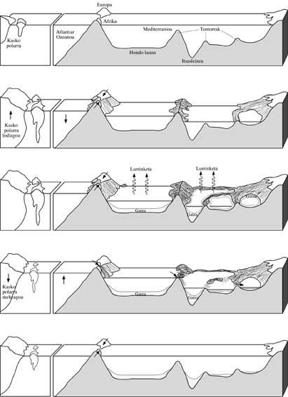 Bestetik, Mediterranioaren hondoko ebaporita guztiak aldi berean sortutakoak ez direla ikusten da. Ertzetako putzuak erdikoak baino lehenago isolatu ziren. Gainera, aro tertziarioan Antarktikoko kasko polarra hotzaren eraginez lodiagotu egin zen eta ozeanoetako maila jaitsi. Horrela, noski, Mediterranioko itsasoa isolatu egin zen.