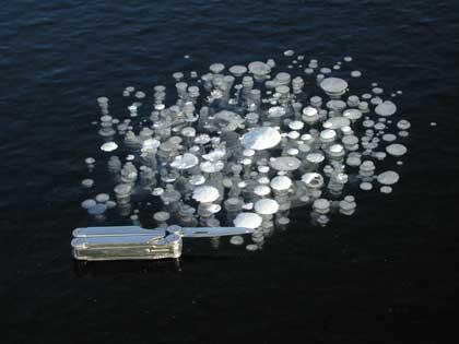 ello. Son burbujas de metano y son los últimos restos de una larga historia; en invierno, cuando los lagos están helados, muchos animales mueren sobre el hielo y, en verano, cuando el hielo se derrite, los cuerpos se hunden en el lago. El metano es el producto de la descomposición de estos animales. Al aumentar el gas, poco a poco se une a las burbujas y sale la superficie del lago. Cuando ocurre en invierno, la burbuja se congela hasta la primavera siguiente. Las burbujas
