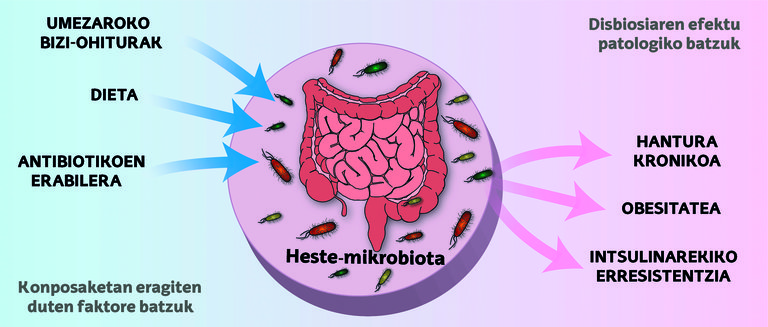 Hala ere, bizitzan zehar, hesteetako ekosistemak aldaketak jasan ditzake, eta horrek eragina du mikrobioen eta gure gorputzaren arteko oreka delikatuan; disbiosi izenarekin ezagutzen da sortzen den egoera hori. Alterazio horiek zenbait arazo sor ditzakete, hala nola hantura, nahasmendu metabolikoak edota intsulinarekiko erresistentzia, eta horrek gaixotasun metabolikoak izateko arriskua areagotzen du (1. irudia) [5].