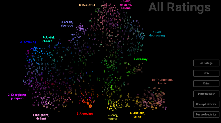 Emozioa identifikatzeaz gain, entzuleek positibotzat ala negatibotzat jotzen ote zituzten ere galdetu zieten, baita emozioa apala ala indartsua ote zen. Emozioen kategoriak eta mailaketak aintzat hartuta, mapa interaktiboa osatu dute ikertzaileek.