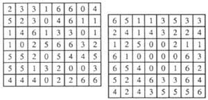 6. Horra hor (3. irudia) zenbakizko dameroak. 7 x 8 laukizuzen hauetan dominoko hogeitazortzi fitxak daude sakabanaturik. Ea aurkitzen dituzun (ezkerrekoak soluzio bakarra du; besteak ordea, zortzi soluzio desberdin ditu eta horregatik zailagoa da).