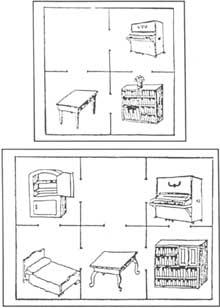 17. Hona hemen bi translazio-problema. Bietan gela bakoitzean altzari bakar bat sartzen dela suposatuko dugu eta bietan jabeek pianoa eta liburutegia lekuz aldatu nahi dutela ere bai, pianoa liburutegia dagoen gelara pasatuz eta alderantziz. Nola jokatu beharko dute, ahalik eta aldaketa gutxien eginez? (6. irudia).
