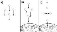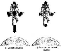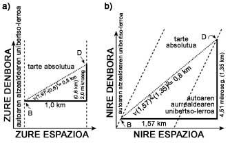 | Einsteinen oparia (1. eranskina) Erlatibitatearen Teoria Orokorra grabitatea deskribatzen duen teoria bat da, 1916an Einsteinek argitaratua. Bere ekarpenen barne daude argiaren desbideratzea izar baten inguruan pasatzean, denboraren moteltzea, Merkurioren perihelioaren desplazamendua, eta, nola ez, guri interesatzen zaizkigun zulo beltzak. Erlatibitatearen Teoria Bereziak erakutsi zigun espazioa eta denbora erlatiboak direla, hots, abiadura ezberdinez bidaiatzen duten behatzaileek luzeren eta denbora-tarteen neurketa ezberdinak egingo dituztela. Hala ere, Hermann Minkowski konturatu zen bezala, unibertsoko fenomenoak azken finean gertaerak dira. Eta gertaera bat deskribatzeko lau zenbaki behar ditugu: hiru bere espazioko posizioa adierazteko eta bat gertatu den unea zehazteko. Gure mundua lau dimentsioko espazio-denbora baten bitartez deskriba dezakegu. Espazioa eta denbora beren kasa erlatiboak badira ere, espazio-denbora absolutua da. Hots, edozein behatzailek, edozein delarik ere bere higidura-egoera, espazio-denborako tarte berdinak neurtuko ditu bi gertakariren artean (I. irudia). Hori oso baliotsua izango da erlatibitate orokorra formulatzerako garaian. Ikus dezagun zergatia. I. irudia. a) Zure espazioan kilometro bateko luzera duen auto batean bidaiatzen ari zara 162.000 km/s-ko abiaduraz, nirekiko. Zure denbora-tartean, argi bat pizten da lehenik autoaren atzealdean (B gertaera), eta 2 mikrosegundoren ondoren, beste argi bat pizten da aurrealdean (D). Bi gertaeren tarte absolutua 0,8 km da zuretzat (espazio-denboran, denbora ere km-tan neurtzen da, eta balio horiek parentesietan agertzen dira). b) Zu autoan zoazen bitartean, ni kalean nago, zuri begira. B eta D gertaeren arteko nire espazio-tartea 1,57 km-koa da eta denbora-tartea, 4,51 mikrosegundokoa. Hala ere, tarte absolutua berdina da: 0,8 km. Giltza marea-indarretan dago. Bai, itsasoko mareak sortzen dituzten indar berdinak. Newtonen grabitatearen teoria jarraituz, espazioaren puntu bakoitzean eremu grabitatorioak intentsitate ezberdinak dituelako azaltzen dira indarrok. Baina Newtonen azalpenek ez dute balio indar horiek ongi ulertzeko. Bere teorian grabitatearen aldaketa distantziarekiko agertzen da giltzarritzat, baina zer distantzia? Nork neurtua? Espazioa erlatiboa baita. Beraz, Lurrera erortzen ari den astronauta baten egoera ez da berdina izango berak deskribatuta eta guk Lurretik ikusita (II. irudia). Garbi dago azalpen horrek ez duela erlatibitate-printzipioa betetzen; beraz, beste zerbaiten bila hasi beharrean gaude. ![]() I I. irudia. Geziek indarren norabideak eta intentsitatea adierazten dituzte. Saia gaitezen honi irtenbide bat aurkitzen. Demagun lau bolatxo hartu ditugula eta Lurretik urrun aske utzi ditugula erronbo-itxuran utziz (III. irudia). Lurrera gerturatzen doazen neurrian, eremuaren eragina nabarmenagoa egingo da, eta beren ibilbide zuzenak aldatu egingo dira. Ibilbideak kurbatuak bilakatzen dira eremuak eragiten dienean. Hemendik, Einsteinek ondorioztatu zuen marea-indarrak espazioaren kurbaduraren erakusgarri zirela. Baina erreferentzia-sistema batean espazioaren kurbadurak beste batean denboraren kurbadura ere badakar, espazioa eta denbora oso lotuta baitaude. Arazo handia da hori. Infinitu erreferentzia-sistema egon daitezkeenez, abiadura eta azelerazio ezberdinekin, infinitu espazio eta denbora kurbatu dauzkagu! Izugarrizko anabasa! III. irudia. a) Lau bolatxo erronbo-forman jarriak eremurik gabeko espazio hutsean. Geziek beren ibilbidea erakusten dute. b) Lurrera gerturatzean beraien ibilbidea nola aldatzen den agertzen da. Goiko eta beheko bolatxoak urruntzen diren bitartean, ezker-eskuin bolatxoak gerturatu egiten dira. Geziek Lurreko behatzaile batek ikusiko lituzkeen bilbide kurbatuak adierazten dituzte. c) Aurreko kasu bera da, baina bolatxoekiko geldiunean dagoen behatzaile batek ikusia. b) eta c) kasuetan agertzen dira ongi behatzaileek ikusten dituzten kurbadura ezberdinak. Hemen agertzen zaigu, ordea, Minkowskiren espazio-denbora absolutua. Espazioaren eta denboraren kurbadurak, bakoitza bere aldetik hartuta, behatzaile bakoitzarentzat ezberdinak dira; espazio-denboraren kurbadura, ordea, denontzat bat eta bakarra izango da. Horrek, zalantzarik gabe, lana asko errazten du, baina gure ulermena pixka bat lausotzen, espazioa eta denbora bakoitza bere aldetik ikusten ohituak baikaude. Komeni zaigu, beraz, behatzaileek espazioa eta denbora nola ikusten dituzten jakitea eremu grabitatorio baten inguruan.