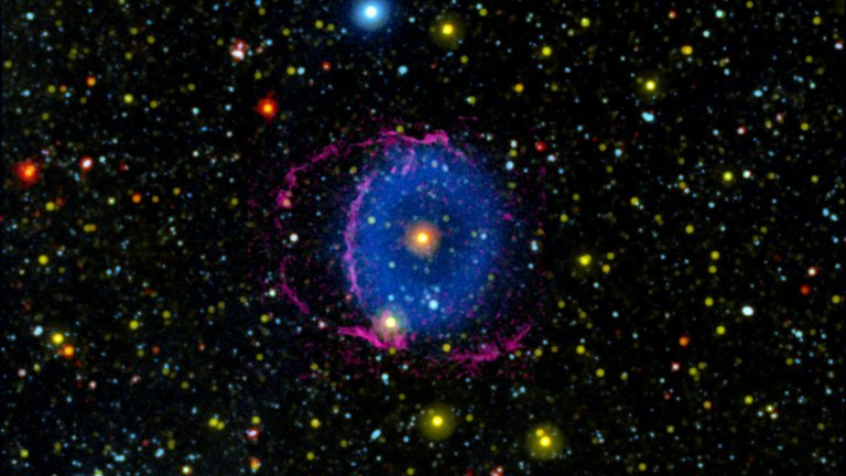 La nebulosa blava és, en realitat, una estrella anomenada TYC 2597-735-1, però a través de la llum ultraviolada es veu un anell blau al voltant de l'estrella. Una nebulosa. I això no és l'habitual, normalment es veu una nebulosa blava entorn de les estrelles, encara que es miri per la llum ultraviolada. Els astrònoms estaven satisfets d'aquest descobriment pel seu interès investigador, però durant 16 anys no han trobat una explicació raonable de l'origen de la nebulosa. Ara sembla que sí. Han entès per què aquesta estrella és com és, és una estrella nounada.