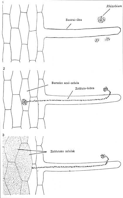 Rhizobium -a 1888. urtean isolatua izan zen eta hamabost urte geroago soroetan inokulatzen zen nekazal produkzioa asko handituz. Egun, espezie honen etorki desberdinak turba birrinduarekin batera ontziratzen dira lurretan sakabanatzeko. Nitrogenoa behar-beharrezkoa da landareen metabolismoan. Dakigunez, konposatu biologiko ugaritan hartzen du parte. Esaterako, proteinen unitateek —aminoazidoek, hain zuzen— nitrogenoa behar dute haien arteko lotura peptidikoak eraikitzeko. Landarea hiltzen denean aminoazidoak degradatu egiten dira eta amoniako edo nitrato-ioi (NO 3 –) eran agertzen dira. Ondoren, bakterio desnitrifikatzaileek nitratoak nitrogeno molekular (N 2 ) bihurtzen dituzte, azken hau atmosferara itzultzen delarik. Honela ixten da nitrogenoaren zikloa.