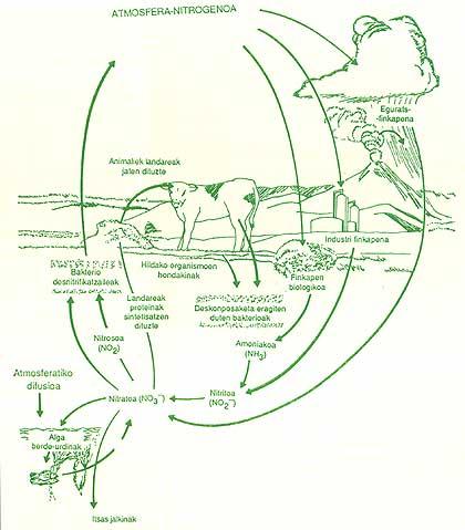 Nitrogenoaren zikloak konposatu nitrogenatuen iturri handi bien —Atmosfera eta Lurrazala— arteko oreka mantentzen du. Landare berdeek nitrogenoa soilik erabil dezakete elementu hau konposatu kimikoen barruan dagoenean: amoniakoan (NH 3 ) adibidez. Horregatik ezin dute nitrogenoa atmosferatik zuzenki atera. Izan ere, atmosferan molekula diatomiko eran (N 2 ) dago. Guzti honen ondorioz nitrogenoa industrialki, prozesu bakteriologiko edo naturalen bidez (esaterako tximist asko duten ekaitzen kasuan) finkatu behar da. Landareek nitrogeno gutxi behar dute, baina etengabe; lurrak nitrogenoa galtzen bait du, drenaiaren bidez eta uzta jasotzean. Gainera ez dugu beste nitrogeno-galera bat ahantzi behar: bakterio desnitrifikatzaileek sorterazitakoa, hain zuzen ere.