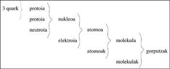 Sei leptoi daude, ezagunena elektroia delarik. Sei dira quark-ak ere, berorien konbinazioz protoia sortzen delarik. Hortik aurrera, errusiar panpinen antzera objektu oro eratzen da 2. koadroan ikus daitekeenez. Halaber, badago materia ez den zerbait gehiago ere: energia, bere zatirik txikiena fotoia delarik.
