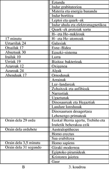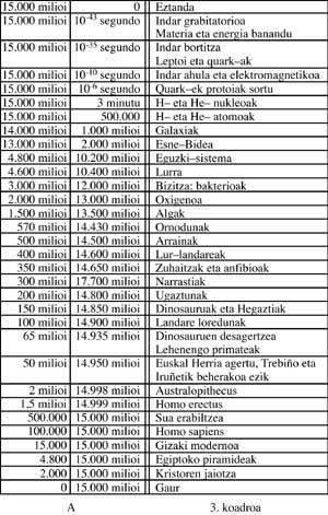 Ipuina bailitzan adierazi dugu munduaren historia. Gainera taula batean idatzi ditugu data guztiak. Haatik, benetan konturatzen al gara proportzioaz? Ez dut uste; ez bait gaude zifra horiek erabiltzera ohiturik. Baina badago milioi guzti horiek menperatzeko erabidea.
