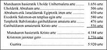 XVIII. mendean Valentziako Unibertsitateko katedradun zen Joan Bautista Bernik munduak 6.000 urte baino gutxiago zituela ondorioztatu zuen Biblian oinarritutako arrazonamenduari jarraituz (ikus 1. koadroa).