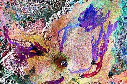 The radar image of the image, taken from space, shows the crater of the Nyamuragira volcano at the bottom of the image. Purple remains belong to the furnace of previous eruptions.