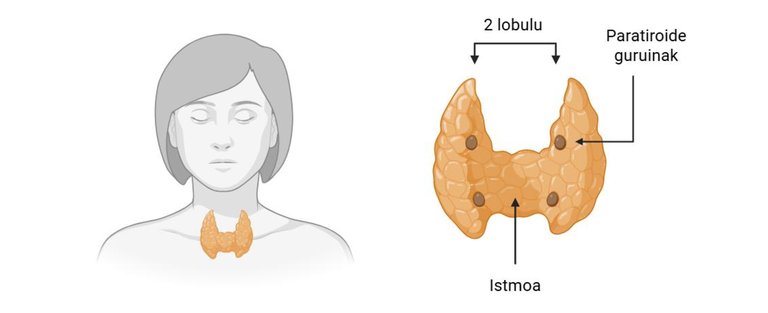 Tximeleta-formako guruin honek tiroxina (T4) eta triiodotironina (T3) izeneko hormonen sintesian parte hartzen du. Prozesu horretarako, beharrezkoa da tiroideak iodoa eta tirosina aminoazidoa eskuratzea. Iodoa dieta bidez lortu eta heste meharrean xurgatzen da bere forma inorganikoan (ioduroa). Bestalde, tiroglobulina izeneko proteina baten sintesia ere ezinbestekoa da: folikulu-zelulek sintetizatzen dute tirosinaren bitartez, eta ondoren, koloidera jariatzen da [2, 3].