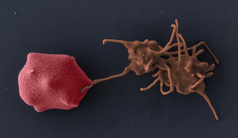 Plasmodium falciparum bizkarroiari erasotzeko gaitasuna dute. Goiko irudian ikus daitekeen bezala, plaketa (eskuinean) globulu gorri infektatuari (ezkerrean) lotzen zaio, eta haren barruko bizkarroia akabatzen du.