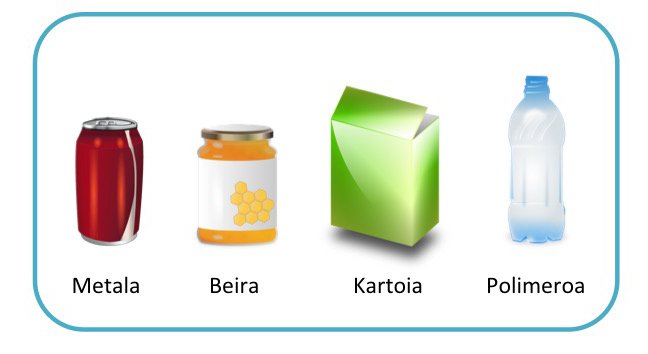 Packaging uses materials such as metal, glass, cardboard and plastic (Figure 1). Each type of material has its advantages and drawbacks. For example, metal and glass are waterproof, i.e., external gases or vapors do not pass through the container and are easily recycled. However, they have some drawbacks: on the one hand, a lot of energy is spent to process these materials, and on the other, they are very heavy, which affects transport, since more fuel is consumed.