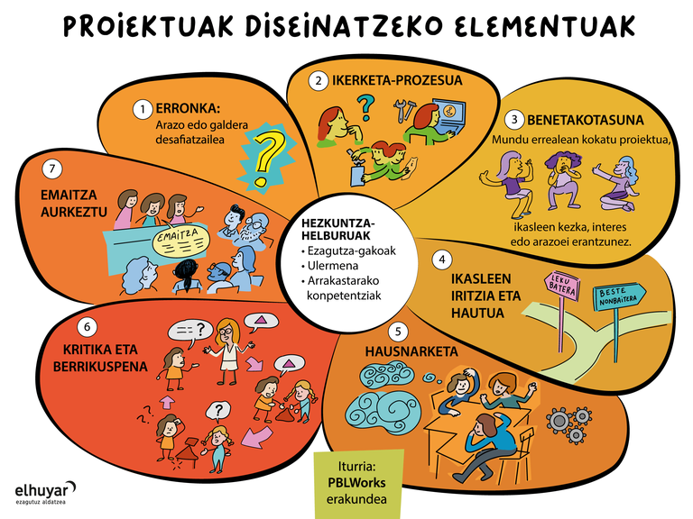 • Ikasleak proiektu horretan mundu errealeko arazo bat konpontzen edo galdera konplexu bati erantzuten saiatzen dira, eta epe ertain edo epe luzeko proiektu batean lan egiten dute (astebetetik ikasturte osora luza daiteke).