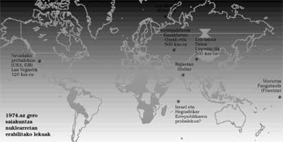 La primera explosión nuclear se produjo en el Nuevo México de Estados Unidos, en Alamogordo, el 16 de julio de 1945, y desde entonces se han contabilizado casi dos mil en todo el mundo. La mayoría se han realizado en Estados Unidos (930 y 217 de ellos en atmósfera). La lista incluye la segunda Unión Soviética con 715 explosiones (183 en atmósfera) y la tercera Francia con 189 explosiones (45 en atmósfera). Sólo el Reino Unido ha provocado 43 explosiones nucleares, pero si se suman las realizadas en colaboración con Estados Unidos, el número aumentaría considerablemente. China también ha provocado 36 explosiones nucleares y una India cercana en 1974.
