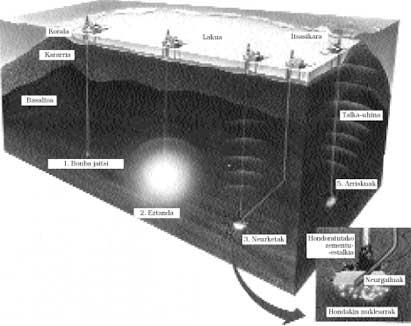 - Tras el estallido, la lava fundida se enfría y apresiona los elementos radiactivos del interior del agujero. Pasarán veinte años para que la temperatura llegue a los 20 al principio. El agua del mar penetra por los rangos del basalto hasta el orificio y, junto al lateral, tiene que realizar otro orificio inclinado.