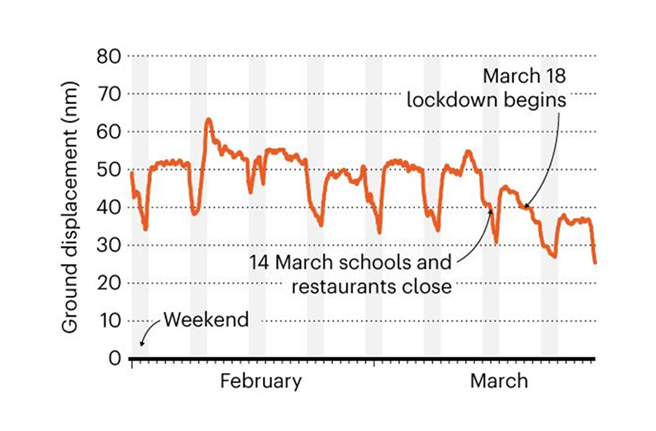 Le premier fut un sismologo belge de l'Observatoire royal de Belgique. La ville de Bruxelles ne vibre pas comme d'habitude. Depuis la mi-mars, on observe dans les graphiques que les vibrations sismiques mesurées à Bruxelles ont réduit au moins 30% les vibrations de fond, ce qu'on appelle bruit de fond. minimum 30%. Le sismologo dit qu'ils ont parfois mesuré une réduction de 50%.