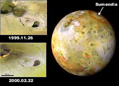La sonde Galileo, envoyée par la NASA pour enquêter sur Jupiter et ses lunes, a pris des photos de l'éruption dans l'un de ces volcans. Maintenant, la sonde se rapproche progressivement du pôle nord d'Io. Le chemin d'accès calculé passera au-dessus de la zone d'éruption, mais il est possible que la sonde soit terminée lorsque vous arrivez à l'endroit le plus proche.