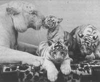 El tigre blanco es uno de los animales más bellos. Mutante del tigre común de Bengala, son muy escasos y raros. En 1951 la Maharaja de Reua atropelló a uno de ellos e inició el crecimiento de los tigres blancos. Desde principios de siglo hasta entonces sólo se habían visto 50 tigres blancos.