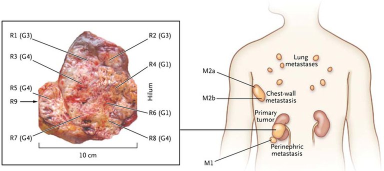 Lau gaixoren giltzurruneko tumoreen azterketa genetiko sakona egin dute ikertzaileek. Horretarako, tumore nagusiaren hainbat puntutatik eta gorputzean zabaldutako tumore metastasikoetatik hartutako laginak aztertu dituzte. Eta ikusi dute tumore barruko dibertsitatea oso handia dela. Esaterako, tumore nagusitik hartutako 14 laginetan aurkitutako mutazioen heren bat bakarrik errepikatzen zen lagin guztietan, eta mutazioen laurden bat lagin bakarrean agertu zen. Tumorean zein gene ziren aktibo aztertzean ere, emaitzak desberdinak izan ziren laginaren arabera.