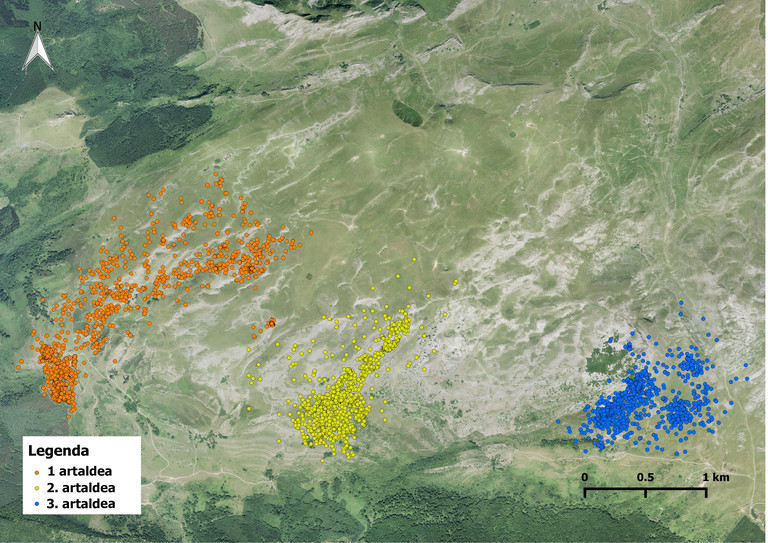 Galdera horiek erantzun ahal izateko, ardiek egunero egiten dituzten joan-etorrien berri izan behar da, baita leku guztiak intentsitate berarekin ustiatzen dituzten ere. Horri erabilera-eremu deritzo, eta ardiak larratzen diren eremuan larratze-intentsitatea zein den kalkulatzen du. Baina kalkulua egin ahal izateko, ardien kokapenak behar dira, eta, horretarako, hiru artaldetako ardiak aukeratu genituen, 40 guztira, eta GPS-iduneko bana jarri genien, bi hilabetez, euren kokapenak erregistratzeko (1. irudia).