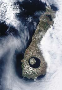 En Rusia, Oneki se encuentra en las islas Kuril entre Japón y la península de Kamchatka. La caldera formada hace 9.000 años por el volcán del sur de la isla se llenó de agua, dando lugar a un segundo cono volcánico en el centro de la misma. Por tanto, dentro de la isla hay otra isla, donde se encuentra el punto más alto de toda la isla: 1.325 m.