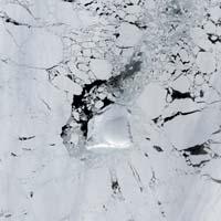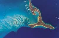 Eleuthera es una de las 29 islas de las Bahamas, larga y fina. Tiene 128 km de longitud (en la imagen sólo se ve el extremo sur) y en algunos puntos tan sólo tiene una anchura aproximada de kilómetro y medio. Al oeste de la isla, las dunas submarinas forman un paisaje espectacular, donde el carbonato cálcico erosionado de los arrecifes coralinos se ha producido por la acumulación de corrientes marinas.