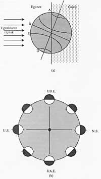 1(a) irudian Lurrak, ardatzaren inklinazioa kontuan izanik, Eguzkiarekiko hartzen dituen posizio erlatiboak ditugu. 3. irudiak posizio ezberdin horietan gertatzen direnak ulertzen lagunduko gaitu. 3(a) irudian Lurra iparraldeko hemisferioan neguko solstizioa gertatzen den unean hartu dugu (Aurrerantzean, aipatzen ez bada ere, solstizio edo ekinozio batetaz ari garenean, beti iparraldeko hemisferioari dagokiona izango da). Egoera honetan irudiko A puntua hartzen badugu, begi-bistakoa da bertatik ez dela Eguzkia ikusten eguneko 24 orduetan.