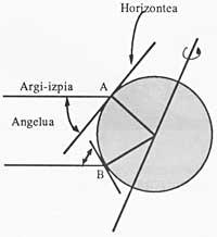 Eguzkiak (eta jeneralean edozein astrok) zeruan hartzen duen altuera, behatzaileak eta Eguzkiak osatzen duen lerroak horizontearekin egiten duen angelua neurtzen digu, 4. irudian hemisferio bietako bi punturekin egin dugun bezalaxe. Hau kontuan izanik, neguko solstizioaren azterketa bukatzeko E puntuari lotuko gatzaizkio. Bertan, egun honetan, Eguzkia zenitean –bertikalaren gainean– dute, hau da, 90°-ko angeluaz ikusten dute. Puntu honek kaprikornio tropikoa definitzen du eta latitude negatiboagoa dutenak ez dute inoiz Eguzkia zenitean ikusten; beste angelu txikiago batez baizik, horrek beroaren probetxamendurako dakarren ondorioekin.