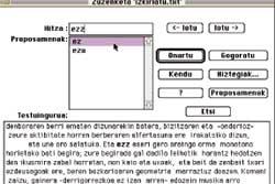 Aprovechando el analizador morfológico automático realizado anteriormente, este programa desarrollado durante los últimos tres años ha sido fruto de la colaboración entre la Facultad de Informática de la UPV/EHU, UZEI y la empresa Hizkia de Baiona. El equipo de la Facultad de Informática ha desarrollado y coordinado el prototipo, UZEI le ha otorgado una garantía lingüística y Hizkia ha asumido la responsabilidad del producto comercial. Se han preparado versiones para Macintosh y PC. En este trabajo no se puede obviar la colaboración de: IVAP/IVAP, Departamento de Economía de la Diputación Foral de Gipuzkoa y Programa de Cooperación Euskadi/Aquitania.