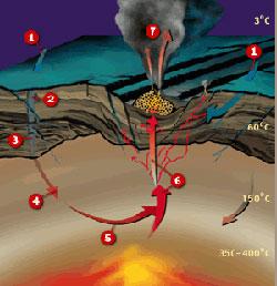 El agua anteriormente sumergida en el subsuelo sale de nuevo de las chimeneas. El agua está muy caliente y llena de minerales, y al entrar en contacto con el agua fría exterior, precipitan los minerales y crean chimeneas.