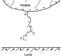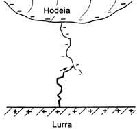Como ya se ha indicado, en este caso la acumulación de carga negativa en la parte inferior de las nubes de trueno, pasa a la superficie terrestre por medio de rayos. ¿Cómo? En las siguientes líneas trataremos de describir el caso más común.