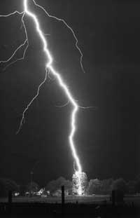 La parte inferior de la nube es mucho más negativa que la superficie terrestre que la tiene enfrente, por lo que los electrones se aceleran hacia el suelo. No obstante, el rayo se canaliza por una vía muy definida, según el proceso posterior. En primer lugar surge algo que se llama “paso líder”. Cada uno de ellos es de forma recta, tiene una longitud aproximada de 50 m y está cargado negativamente de la nube. Cada paso se realiza de forma muy rápida (por ejemplo, la sexta parte de la velocidad de la luz) y luego se detiene, con unos 50 microsegundos, para dar un paso más, cambiando de dirección, haciendo a todos un camino similar al de la figura 9.