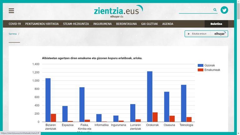 Albisteak Wikidata ezagutza-baseko kontzeptuekin lotuta daudenez, ezagutza-base horren egituraren (taxonomia) araberako kontsultak egin daitezke. Horrek zientzia.eus-eko albisteetan oinarritutako analitikak egitea ahalbidetzen du. Kasu honetan, analitikak ikusmira ezberdinen arabera egin dira (generoa, lurraldea, hizkuntza, jatorria, ezagutza-alorra, ...) eta, betiere, adierazle neurgarrien bidez. Funtzionalitate honen lehenengo bertsioan generoari lotutako adierazleetan jarri da arreta.