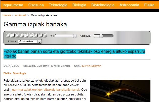 Lan horretan aitzindari den EHUko Aholab ikerketa-taldeak kalitate oso oneko ahots sintetiko neutroa lortua du. Orain, Aholabekin elkarlanean, Elhuyarrek webguneak irakurri beharrean entzuteko teknologia garatu du, eta Zientzia.net-en eta Elhuyar aldizkariaren webgunean jarri. Zientzia.net-eko edozein testuzko edukitan “play” botoi bat dago orain. Hori sakatuta, artikulua entzuten hasiko gara. Entzuketan nabigatu ahal izateko botoiak ere badaude, eta gizonezko edo emakumezko baten ahotsa, bolumena zein abiadura alda ditzakegu. Probatu!