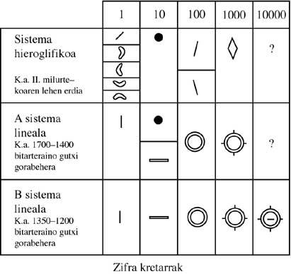 Kretarren sistema egyptiarrenaren guztiz antzekoa zen, hamar oinarria erabiltzeaz gain ikur berezia hamarraren berredurei bakarrik lotzen zietelako. Urte hauetan zehar (2.000-1.200) zenbakien ikurrak aldatu egin ziren zenbakikuntz printzipio kretarra bera mantenduz.