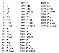 Hasierako zazpi ikurrekin 5000 baino zenbaki txikiagoak bakarrik adieraz zitezkeen. Aurrera egiteko Errepublika garaian beste lau zenbakiri egokitu zitzaien ikur berezia; 5000, 10.000, 50.000 eta 100.000 zenbakiei. Horretaz gain, idazkerari buruzko zenbait konbentzio ezarri zuten. Hauetako bat marra baten azpian idatzitako edozein ikurren balioa milaz biderkatzean zetzan: