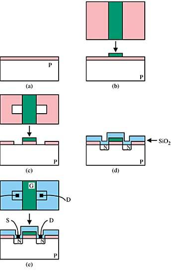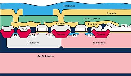 Adibidez, 8. irudian nMOS motako transistore baten fabrikazio-urratsak erakusten dira. Hemendik aurrera hartutako fitxa P motakoa dela pentsatuko dugu, eta hau izango da zirkuitu integratuaren oinarria edo substratua.