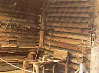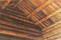 En los muros se abren ventanas de dos hojas, dotándolas exteriormente de contraventanas de madera. Los techos de las habitaciones también se realizan con los troncos tumbados, colocados de vez en cuando y cubiertos por encima y por debajo de las tablas. Si la luz es suficientemente grande, colocan una columna de tamaño suficiente. El entramado del tejado y de los cabrios se compone de unos troncos de tamaño que nosotros hacemos entresacados, colocados con sus cuestas, cubiertos de tablas. Ahora por encima de estas tablas se coloca en casi todas las casas, y porque se ve tanto o, a decir verdad, no duele a la vista. En el interior, en la cocina, se fabrica una especie de horno para hacer fuego con barro, pero otra cosa sería comunicarlo.