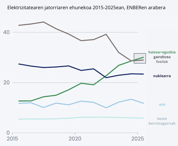 Iaz eguzkiak eta haizeak elektrizitate gehiago sortu zuten fosilek baino EBn