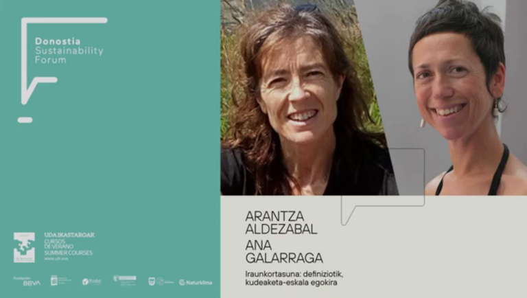 Arantza Aldezabal inició la conversación recordando y reflexionando sobre la definición de la sostenibilidad. En respuesta a las preguntas de Ana Galarraga, habló de la complejidad multidimensional en el contexto de la emergencia climática y lo relacionó con el sector primario, entre otros aspectos, la soberanía alimentaria y la economía circular.