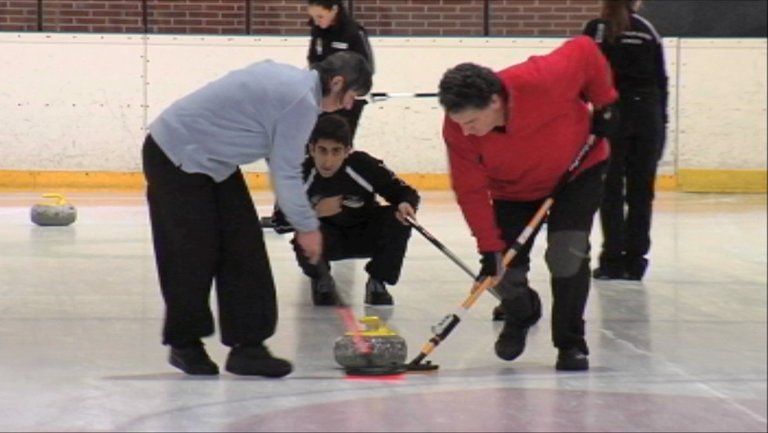 M. Ou.M.: É dicir, é un traballo en equipo. Un deles lanzará, outros dous varrerán, ou non, iso decídeo o capitán que está alén. O capitán medirá si o tiro é demasiado rápido ou demasiado lento ou si a parábola é boa e en función diso diralles que si ou que non.