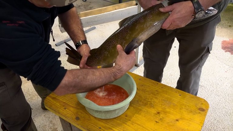 Quand ils sont prêts à pondre, ils rassemblent les saumons mâles et femelles dans la pépinière. Ils font sortir les œufs et la graine, les mélangent et essayent de reproduire ce qui se passe naturellement dans la nature.